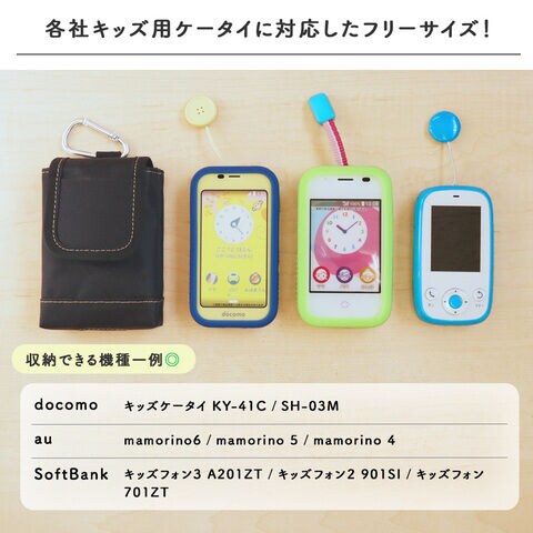 ◆ドコモ・au・ソフトバンクのキッズ用ケータイが 「カバーあり」「カバーなし」のどちらでも収納出来ます。ランドセル以外にも通学カバンや塾カバンにも取り付けられます。