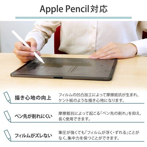 フィルム表面の微細な凹凸加工によって接触面に程よい摩擦抵抗が生まれるので、Apple Pencilを使って快適に文字やイラストを書く(描く)ことができます。