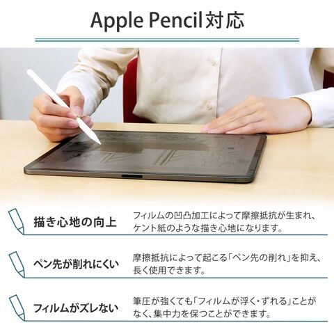 ◆フィルム表面の微細な凹凸加工によって接触面に程よい摩擦抵抗が生まれ、Apple Pencilを使って快適に文字やイラストを書く(描く)ことができます。