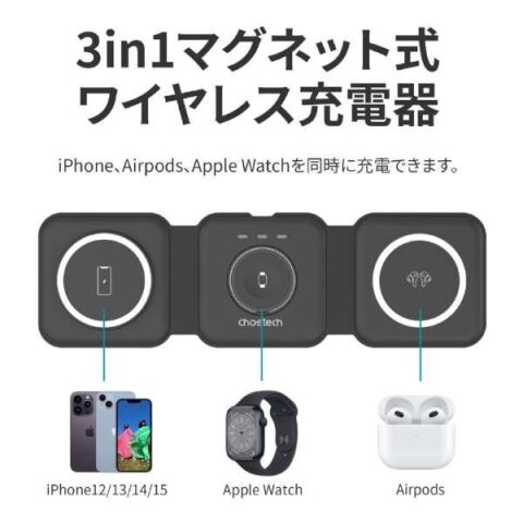 CHOETECH(チョエテック) 3-in-1 折りたたみ式 磁気ワイヤレス急速充電器(ブラック) T588-F-CCBK 【返品種別A】