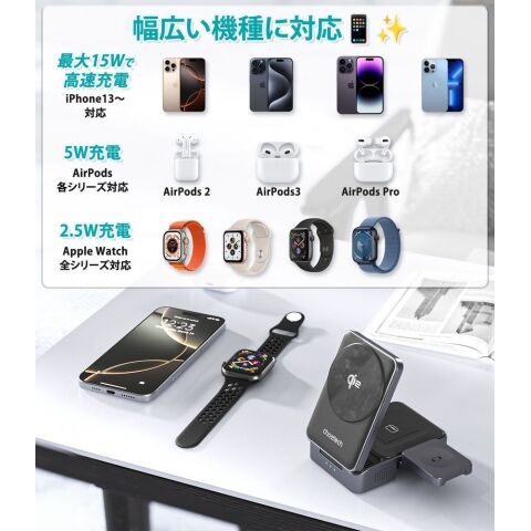 ◆3台同時充電対応:スマホ・ウォッチ・イヤホンを同時にワイヤレス充電