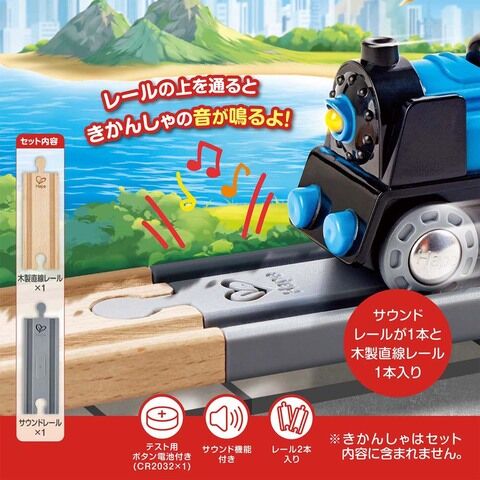電車が通るたびに機関車の音が鳴る不思議なレールと木製直線レールのセット!