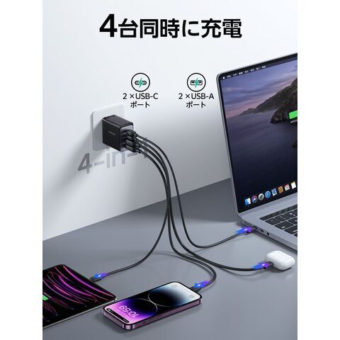 ◆ノートパソコン2台同時、複数のタブレットやスマートフォンなどに充電可能(4ポート:USB-C x2、USB-A x2)