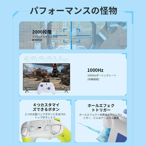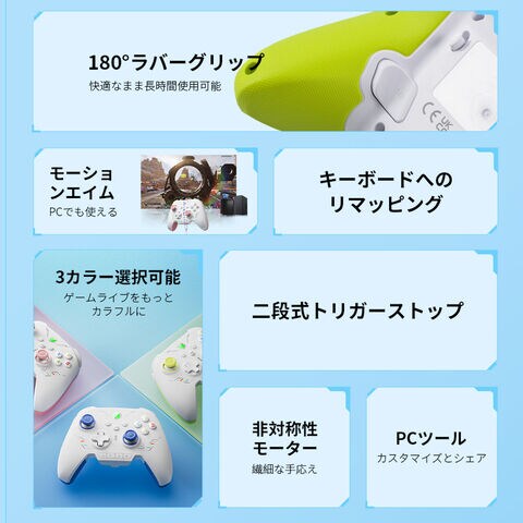 任天堂Switch/Windows10&11/スマートフォン(iOS、Android)に対応したワイヤレス接続、USB有線接続両対応のゲーミングコントローラーです。滑り止め加工されたラバーグリップはどんなシチュエーションでも正確なコントロールを実現します。有線接続時にはポーリングレート1000Hzを実現し、瞬時の反応を求められるFPSゲームで実力を発揮できます。