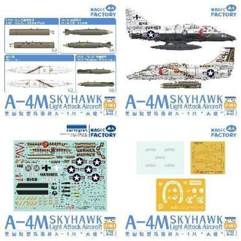 A-4M初期型かA-4Mのどちらかを選択して組み立てることが出来ます コントロールサーフェイス、主翼/胴体エアブレーキは別パーツ 前縁スラットの内側パーツを別パーツ化 水平尾翼はエレベーターだけでなく全体を前後に傾けることが可能な設計 機首内の電子機器パーツを再現、機首横のハッチは開閉選択可 乗降ラダー、FODカバーパーツ付属 パーツ分割によりAPU無(A-4M 初期型)、APU有(A-4M)を再現 LAU-10/A ロケットポッド、Mk81、Mk82爆弾、増槽付属 デカール(カルトグラフ製)2種とエッチングパーツ付属