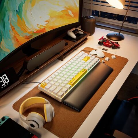 ダブルショット PBT キーキャップは半透明の文字と、油の蓄積や摩耗に強い洗練された質感を特徴としており、キーストロークごとに鮮明で一貫した感触を長年にわたって提供します。