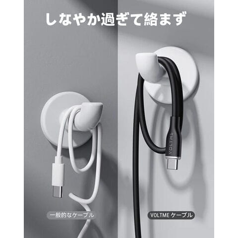 外装にシリコン素材を使用。従来のケーブルにはない柔らかい質感を実現しました。カバンやポケットに入れても絡みにくいので持ち運びにもぴったりです。25000回の折り曲げテストを実施。断線しにくく、長く利用できる高い耐久性のUSBケーブルです。