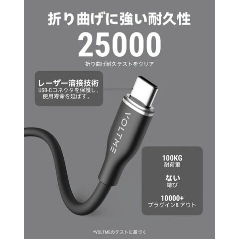 VOLTME PD ケーブル内部の銅線をグラフェンで覆い、外装にシリコン素材を使用した3層構造を採用し、しっとりとした心地よい手触りを実現。触るたびなめらかで気分が上がります。更に25000回の折り曲げテストを実施。ケーブル内部のワイヤーを断線から保護し、究極の耐久性を実現しました。