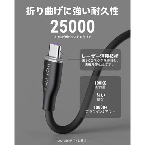 VOLTME USBケーブルは25000回以上の厳しい折り曲げテストと10000回以上の抜き差しテストを実施し、従来のケーブルにはない耐久性を実現しました。ケーブル内部のワイヤーを断線から保護し、長く使用できる充電ケーブルです。