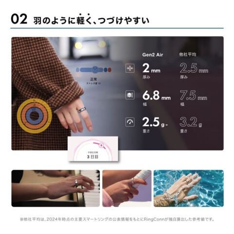 Gen2Airは、羽のような超軽量かつ薄型のボディに、最大10日駆動のロングバッテリーを搭載したスマートリングです。