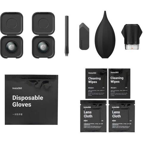 Insta360 X5用の純正交換レンズ1枚と、ご自宅でのレンズ交換やクリーニングに必要なツール一式が付属します。