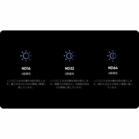 ND16、ND32、ND64フィルターを切り替えて、どのような光でも完璧なショットが決められます。