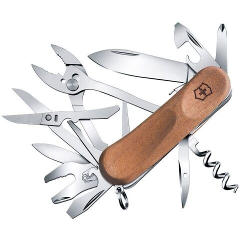 ◆ビクトリノックスのロゴが彫り込まれた、エレガントな木材を使用したハンドルのマルチツールは、美しいうえに使い勝手も抜群です。