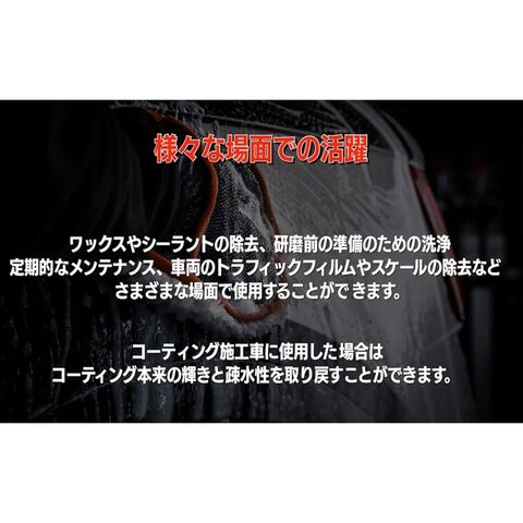 ◆ワックスやシーラントの除去、ポリッシングの準備、塗装面に付着したトラフィックフィルムやミネラルの除去に使用することができます。