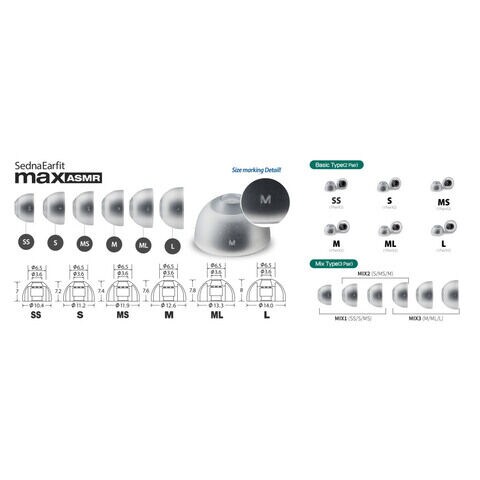 SednaEarfit max ASMRは、一般サイズのStandardタイプを採用しています。中間サイズを含めたSS/S/MS/M/ML/Lの計6サイズで、より多くの方にフィッティングしやすくしています。