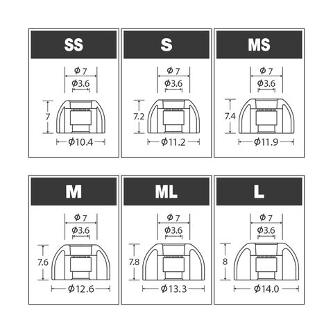 SednaEarfit XELASTEC IIは、一般サイズのStandardタイプを採用しています。中間サイズを含めたSS/S/MS/M/ML/Lの計6サイズで、より多くの方にフィッティングしやすくしています。
