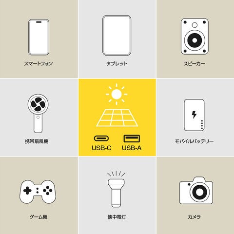 USB-AとUSB-Cポートを搭載。スマートフォン、イヤホン、モバイルバッテリー、携帯扇風機、懐中電灯、デジタルカメラなどUSBで充電可能な機器に幅広く対応。外出先や緊急時に頼りになります。