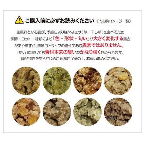 ※主原料となる鹿が、季節により様々なエサ(草・干し草)を食べるため 季節・ロット・種類により 「色・形状・匂い」が大きく変化する場合があります。