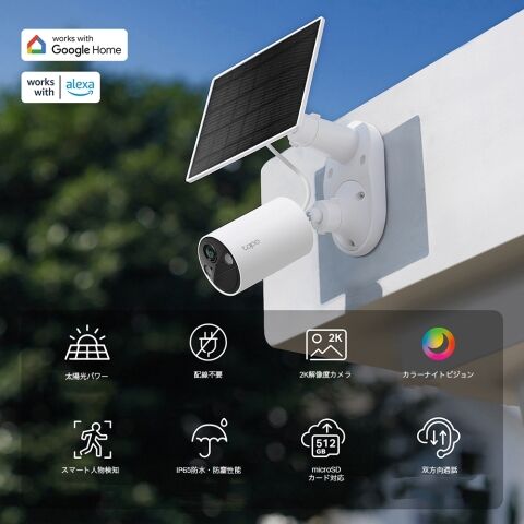 • 電源:リチウムイオンバッテリー(内蔵)、ソーラーパネル:Tapo A201(付属)