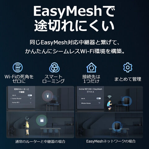 EasyMesh技術と互換性のあるネットワーク機器と連携させることて゛、シームレスなメッシュWi-Fi環境を構築することも可能です。