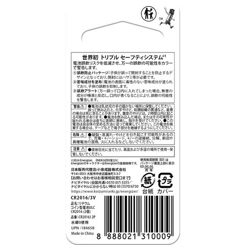 「開けさせない」、「飲み込ませない」、「口に入れたかすぐわかる」、3つの安心を備えたコイン型電池です。
