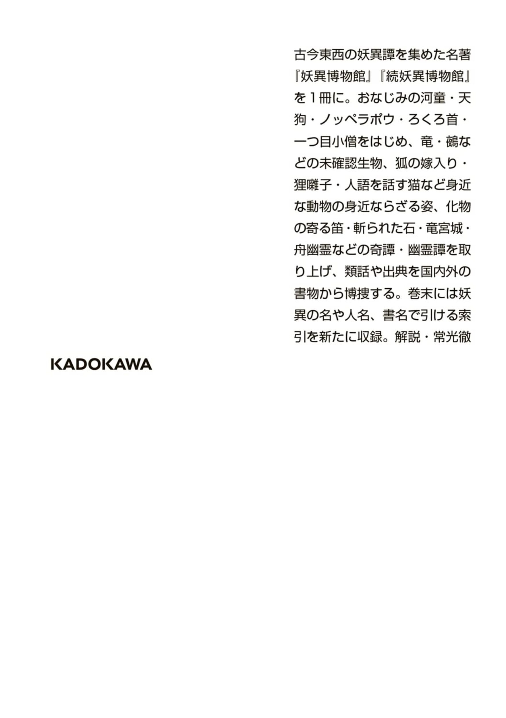 | 古今東西、日本各地の奇談・怪談を1冊に。ろくろ首、化け猫、河童などの幽霊・妖怪から怪鳥退治の話題まで。さらにその類例や原典を、国内外から探し出す。巻末には新たに索引も収録。底本は『妖異博物館』、『続 妖異博物館』(ともに青蛙房刊)。 解説:常光徹 【目次】 妖異博物館 化物振舞/大入道/一つ目小僧/轆轤首/舟幽霊/人身御供/人魂/異形の顔/深夜の訪問/ものいう人形/ものいう猫/怪火/狸の火 大猫/化け猫/狐の嫁入り/狸囃子/猿の刀・狸の刀/鼠妖/大鳥/白鴉/河童の執念/海の河童/百足と蛇/古蝦蟇/蜘蛛の網/大鯰/妖花/茸の毒 果心居士/飯綱の法/山中の異女/人の溶ける薬/煙草の効用/天狗になった人/天狗の夜宴/ 生霊/小さな妖精/執念の転化/気の病/形なき妖/大山伏/消える灯/夜光珠/化物の寄る笛/持ち去られた鐘/銭降る/猫の小判/雁の財布/古兜/斬られた石/魚石/提馬風/風穴 など 続妖異博物館 月の話/大なる幻術/雷公/雨乞い/鎌鼬/空を飛ぶ話/地中の声 宿命/火災の前兆/家屋倒壊/卒堵婆の血/経帷子/井の底の鏡/五色筆/難病治癒/診療綺譚/髑髏譚/眼玉/首なし/ノッペラポウ 竜宮類話/羅生門類話/妖魅の会合/雨夜の怪/死者の影/離魂病/樹怪/くさびら 仏と魔/金銀の精/名剣/不思議な車/樽と甕/埋もれた鐘/巌窟の宝/打出の小槌/金の亀 竜に乗る/竜の変り種/虎の皮/馬にされる話/牛になった人/猿の妖/狐の化け損ね/獺/鶴になった人/化鳥退治/大魚/鰻/胡蝶怪/蜂/銭と蛇 など 解説 索引 |