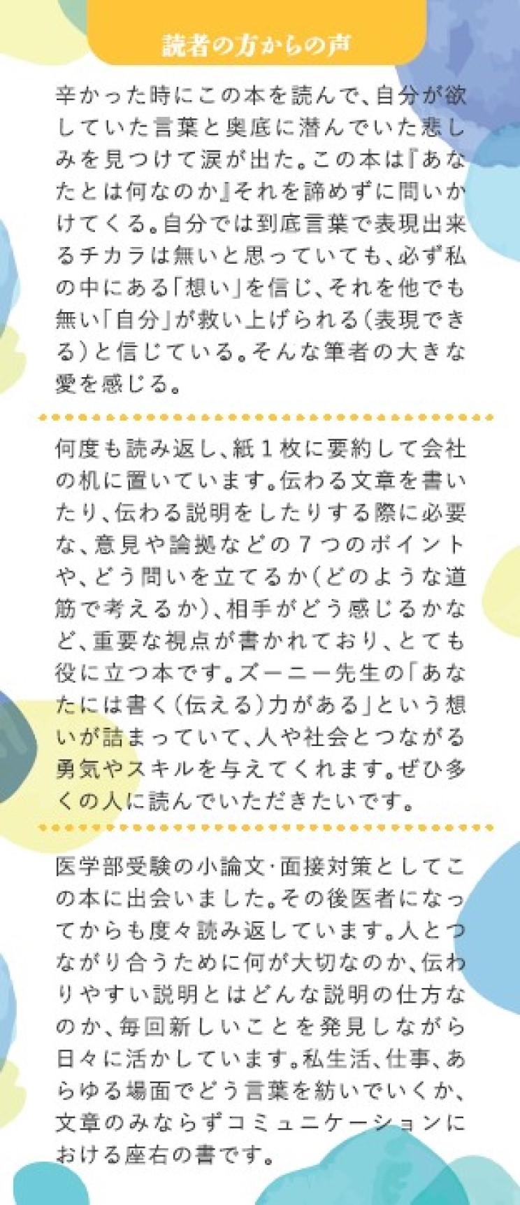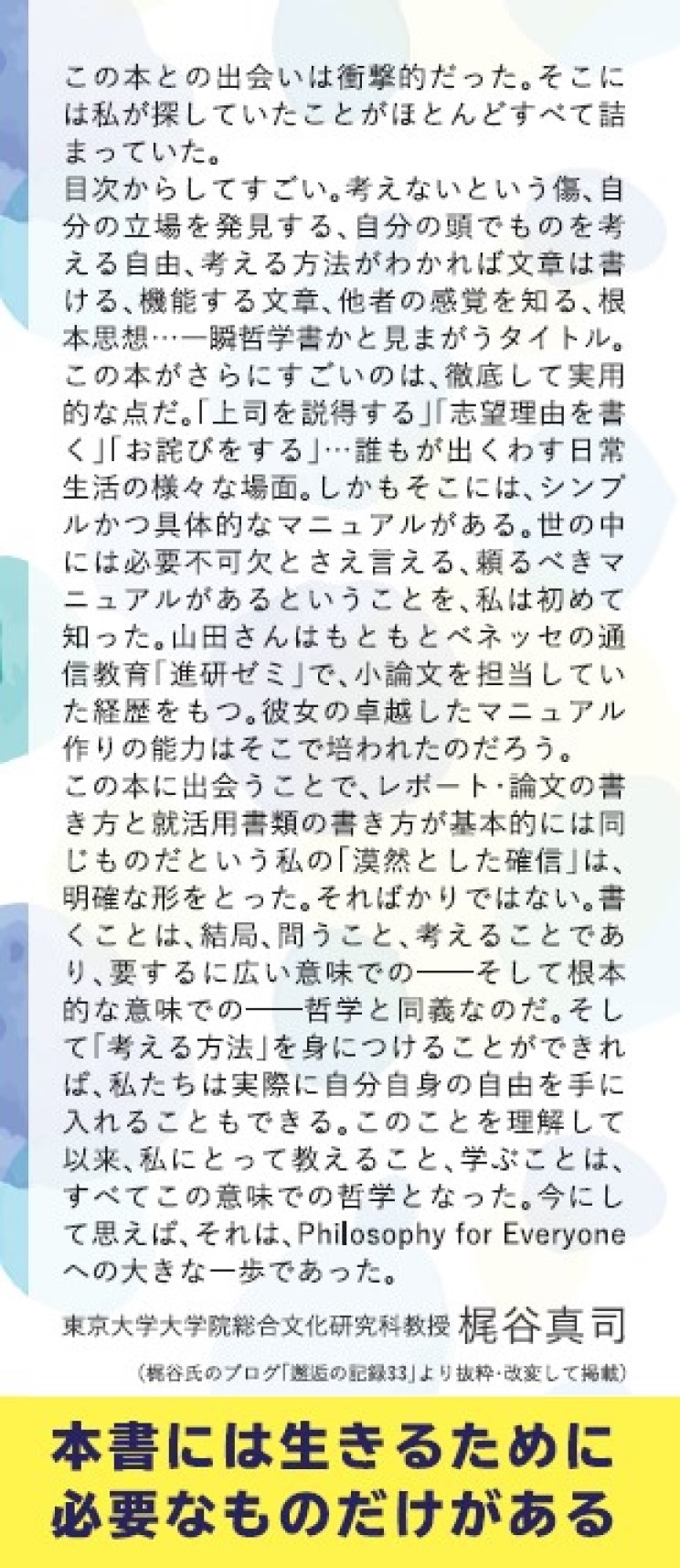 | あなたには書く力がある!伝え続けて、20年超のロングセラー、重版54刷!「想いが書けた!」「伝わった!」「就職できた!」読者から歓びの声、続々 驚くほどわかりやすく、徹底して実用的、なのに、「泣けた」という読者も多数、書くことの本質に迫る「感動」の文章術。 「書けるようになった!」「この本のおかげで初めての本を出版できた!」「就職できた!」「大切な人に想いが伝わった!」と、読んだ人から歓びの声続々! 東京大学大学院アカデミック・ライティング参考図書に採用されるなど、文章指導者・研究者・プロライターからも高く評価されている一冊。それでいて、10代が読んでも手に取るようにわかりやすい。その秘密は、著者の出発点が「高校生の考える力・書く力の育成」であったから。 Benesse小論文編集長としてメソッドを開発し、「考える方法をつかめば、だれでも実感ある伝わる文章が書ける」ことを発見。書く歓びを、高校生からもっと幅広い層へと、2000年にフリーランスになり、慶應義塾大学、三井物産株式会社をはじめ全国多数の大学・企業で一生通用する文章表現力を育成。とくに全国各地で開かれる表現力のワークショップでは、「初心者も4時間で見違える文章を書く!」「心底の想いが表現できる!」「私にも書く力があると発見できた!」と熱い感動を呼んでいる。 お願い、お詫び、議事録など、私たちは日々、文章を書いている。 どんな小さなメモにも、そこには読み手がいて、目指す結果がある。 ではそのような場面で、どうしたら誤解されずに自分の思いを伝え、読み手の気持ちを動かすことができるのだろう? 本書では「意見」「望む結果」「論点」「読み手」「自分の立場」「論拠」「根本思想」の七つの視点から、よい文章を書くための戦略をアドバイス。「自分の意見が見つからないときは、小さな問いを立ててみる」「テーマと論点の違いを意識する」など今日からつかえるノウハウを、具体的な文例を紹介しながら、解説していく。単なる文章のテクニックをこえ、自分の頭で考え他者と関 わることの痛みと歓びを問いかける、コミュニケーションの本質に迫る一冊。 生成AIの時代に、自ら考える力がつく! もっと書ける自分になる本 |
