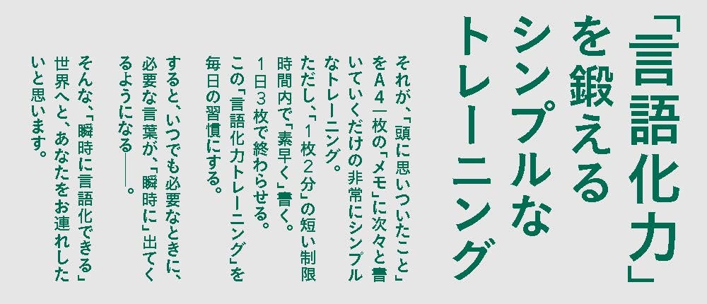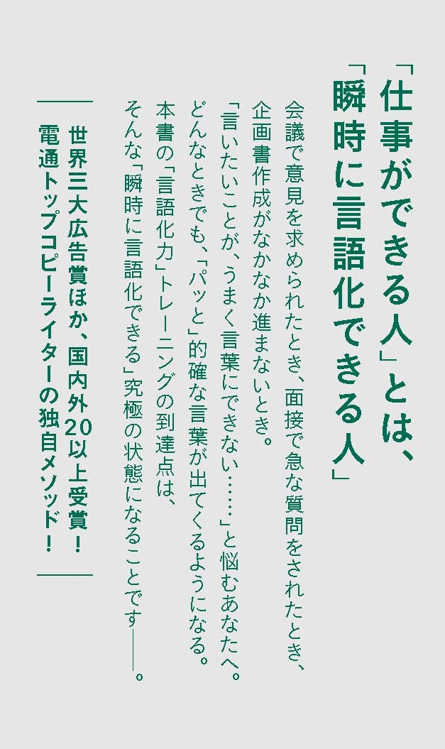 | 【15万部突破のベストセラー!!】 【いま一番売れてる「言語化力」 の本!!】 「言いたいことが、うまく言葉にできない……」 と悩む人が多い。 例えば、 ・【会議】「どう思う?」と聞かれても、うまく答えられない……。 ・【面接】その会社への「思い」を、うまく言葉にできない……。 ・【企画書】「ぼんやりとしたイメージ」はあるのに、いい言葉が思いつかない……。 本書は、そんな「思いをうまく言葉にできない……」 と悩むビジネスパーソンに向けて、 「言語化力」を鍛えるメソッドを伝えるものだ。 そのメソッドとは、 「頭に思いついたこと」を A4一枚の「メモ」に次々と書いていくだけの 非常にシンプルなトレーニング。 ただし、「1枚2分」の短い制限時間内で「素早く」書く。 1日3枚で終わらせる。 この「言語化力トレーニング」を毎日の習慣にする。 すると、いつでも必要なときに、必要な言葉が、 「瞬時に」出てくるようになる――。 そんな「瞬時に言語化できる」世界へと、あなたをお連れしよう。 世界三大広告賞ほか、国内外20以上のアワード受賞! 電通トップコピーライターが明かす独自メソッド、初公開! |