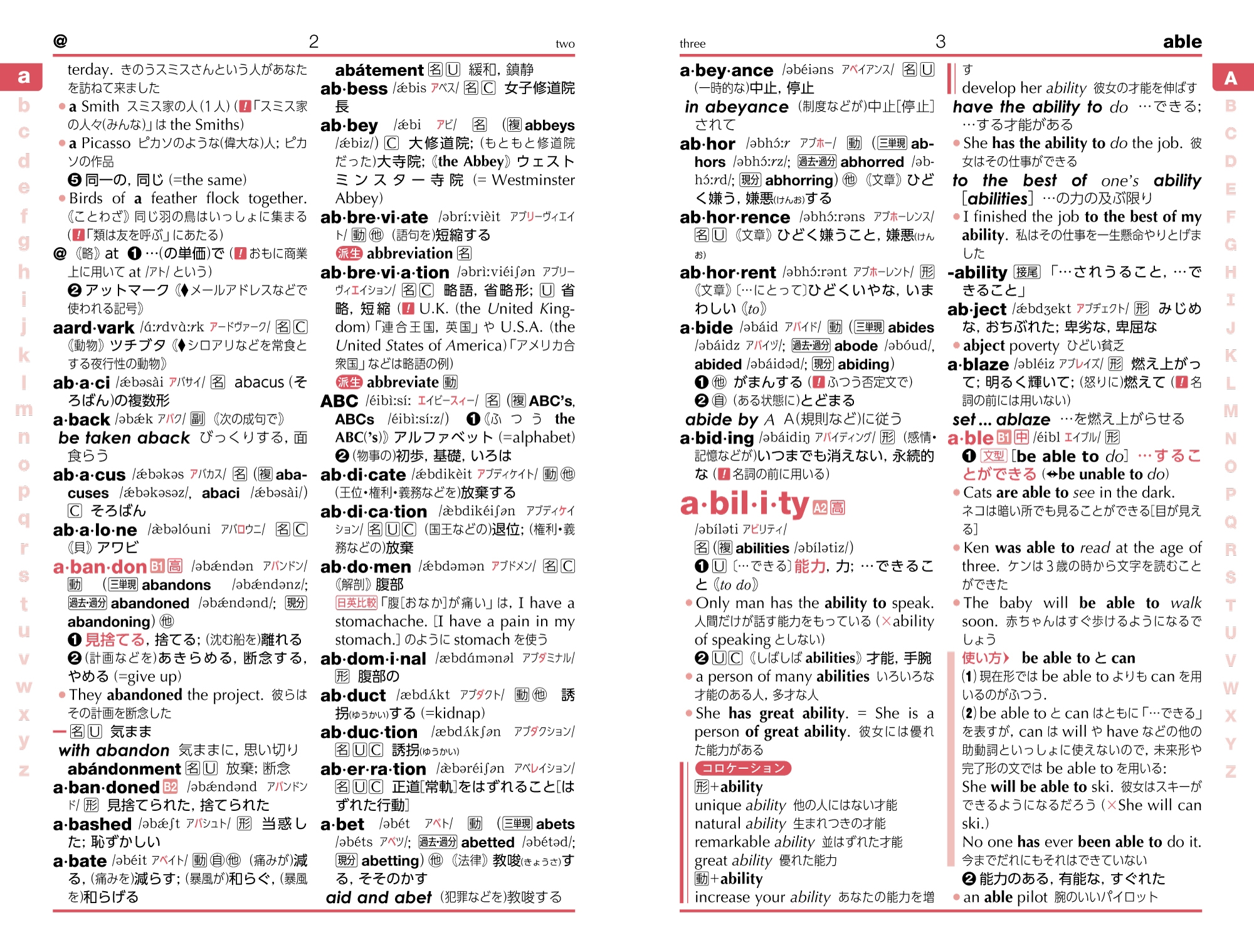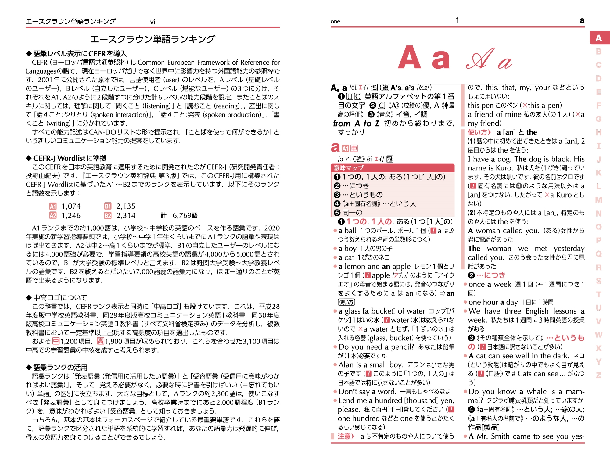 | 時代が求める本物の英語「発信力」をつける辞書 2009年の初版刊行以来,圧倒的な読みやすさとわかりやすさで支持されてきたエースクラウン。8年連続で高校・中学の採用推薦がNo.1と,絶大な信頼を得ています。 人気の秘密は,初級者にやさしいこと。中学から高校初級向けに作られたこの辞書は,英語が苦手な読者にも使いやすい工夫がいっぱいで,大人の学び直しにも最適です。 エースクラウンといえば一番の特長は「フォーカスページ」。まるまる1から2ページを使って「もっとも重要な基本単語」をくわしく解説するページです。ビッグデータを解析することでわかったエッセンスをまとめているので,英語の基本を効率よく身につけ,発信力(話す力・書く力)を高めることができます。 さらに新コラム「チャンクでおぼえよう!」では,基本動詞の代表的なチャンク(意味的なまとまりのある数語のかたまり)を日本語→英語の順でおぼえることで,英語が口をついて出るようにうながします。 もうひとつの新コラム「CAN-DO Tips」では,ある表現を身につけると「英語で何ができるようになるのか」というCAN-DOの発想を取り入れ,身につけた英語を使って行動することをイメージさせます。語彙学習を単なる知識の暗記では終わらせません。 大学入試が4技能になり,英語で話したり書いたりすることがますます求められる時代に,エースクラウンは「発信力」をつける辞書のあり方を提案します。 さらに詳しい内容をご紹介 おもな特長 「話す」「書く」にも役立つ単語学習に ●重要な単語をしっかり深く学ぶ 「フォーカスページ」 ●そのまま使える用例で表現力をアップ 「チャンクでおぼえよう!」新設 ●身につけると何ができるようになるのかを示す 「CAN-DO Tips」新設 ●コンパクトな和英小辞典つき 「高校実業科・ICT用語小辞典」を追加 ●生活語彙をイラストで学ぶピクチャーページ 「ICT用語」「五輪/パラ種目」などの新ページを追加 ●高校基礎レベルに十分な収録項目数 英和5万1千/和英2万4千 |