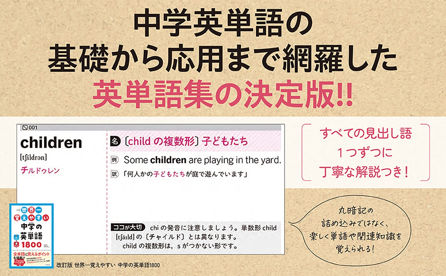 | 進学塾だからこその、学校では教えてくれない効果的な覚え方が満載! すべての単語に覚えるポイントの解説があるから覚えやすい! 中学英単語帳の決定版!! 2万人が選んだベストセラーが、2021年の新課程&入試の最新傾向に対応して300単語追加でパワーアップして登場!※1 さらに、赤シート&音声ダウンロードつき。※2 <改訂版のポイント> 1、中学英単語の基礎から応用まで、すべてを網羅した単語集の決定版! 中学で習う英単語を完全網羅。 「超基本レベル・必修レベル・標準レベル・発展レベル」と習熟度別に掲載しているから、 ステップアップしながら着実に英単語を身につけることができます。 2、2021年の新課程&入試の最新傾向に対応! 中学英語の最新傾向に完全対応! 見出し語のひとつひとつに丁寧な解説がついているので英語が短期間で覚えられます。 今まで英単語を覚えられなかった人でも、この本なら必ずやりきることができるはず。 ※1 累計2万部突破 ※2 日本語音声は声優の高橋美佳子さんが担当。 |
