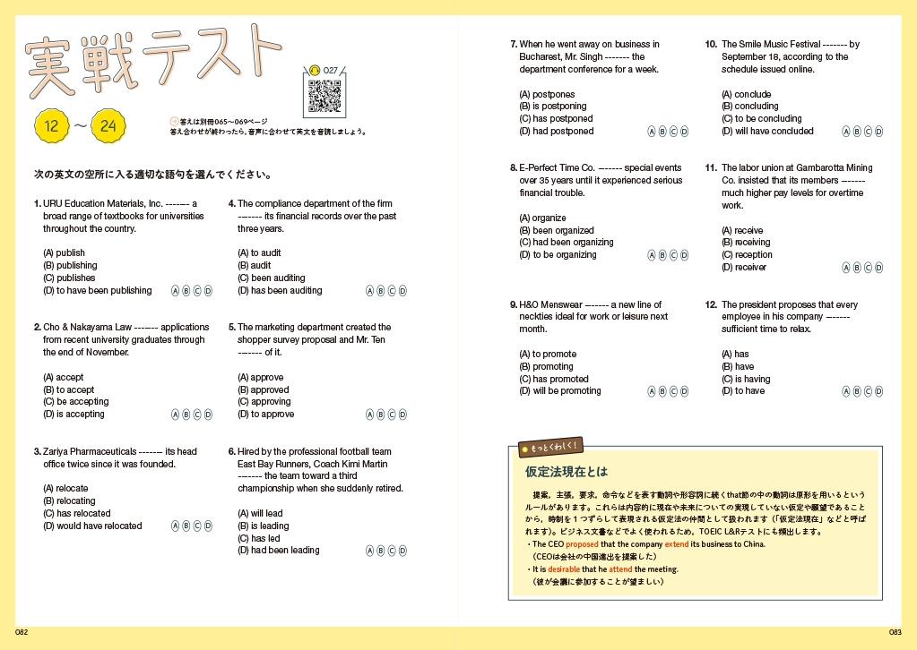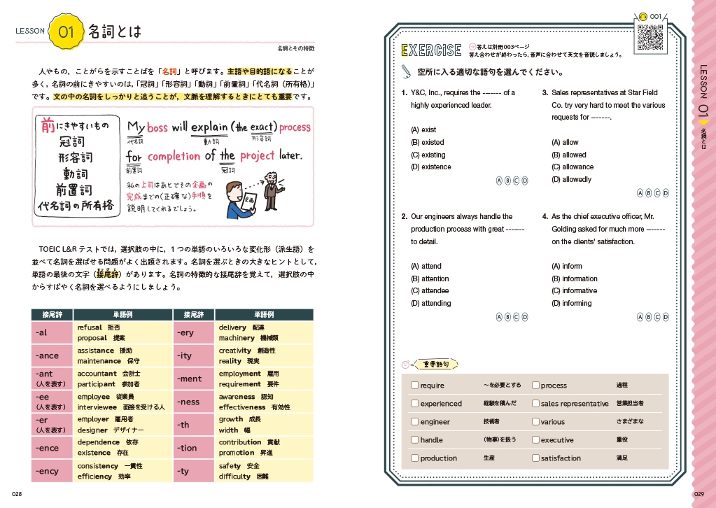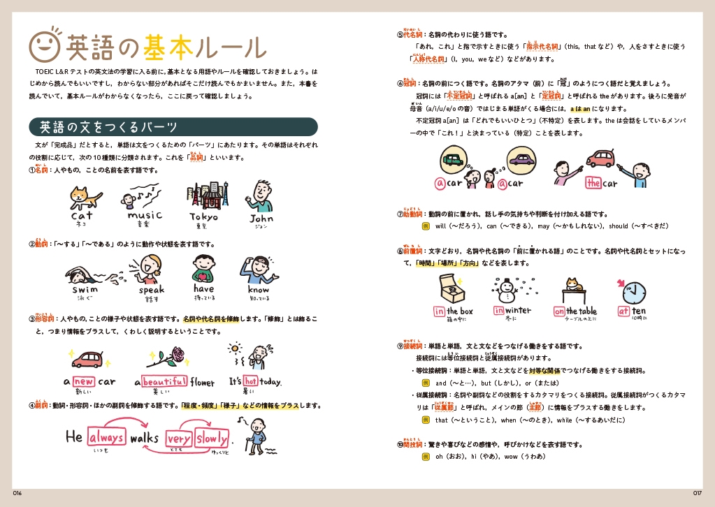 | ★シリーズ累計900万部突破の「ひとつひとつ」シリーズのTOEIC(R) L&Rテスト対策版★ イラスト満載の解説&豊富な練習問題で、英文法の超基礎からPart 5&6攻略のコツまでわかる! TOEIC L&Rテストで600~730点をめざす人におすすめ! TOEIC英文法入門書の新定番!! 本書の特長[FEATURES] 01 TOEIC攻略にほんとうに必要な英文法をやさしい文章とイラスト、図解で解説! 02 基本の解説+EXERCISE(練習問題)の1レッスン2ページ完結だからつまずかない! 03 豊富な練習問題+くわしい別冊・解答解説でPart 5&6の解き方もわかる! 04 音声はスマホでかんたん再生! 誌面の二次元コードやMP3ダウンロードなどさまざまな使用スタイルに対応! 05 音声はイギリス英語、アメリカ英語の2種類を用意! イギリス発音にも強くなれる!! ■はじめての人も、もう一度の人も超基礎からやさしく学べる! TOEIC L&R テストで600~730点をめざすみなさんにとって、 ほんとうに必要な英文法を、やさしい文章とイラスト・図解で解説しています。 内容を厳選して、1テーマ基本2ページで展開しているので、無理なく、効率よく学習できます。 ■本番レベルの「練習問題」とくわしい解説で実戦力が身につく! 章ごとの「EXERCISE」、まとまりごとに復習できる「実戦テスト」、 巻末の「模擬試験」など本番しベルの練習問題を豊富に収録しています。 解答はすべて別冊に収録。問題を再掲した上で、くわしい解説をしているので、 別冊だけを取り外して学習することもできます。 ■スマホで簡単!音声再生リスニングのトレーニングもできる! EXERCISE、実戦テスト、模援試験の正解英文を読み上げた音声を用意しています。 音声は、スマホ(各ページの二次元コードまたはアプリから)で聞くことができます。 PCで聞きたい方のために、MP3形式の音声も無料でダウンロードいただけます。 また、AI英語教材 abceed での音声再生にも対応しています。 音声を使って、音読などのトレーニングをすることで、リスニング力の基礎を養うことができます。 英語音声はイギリス英語とアメリカ英語の2種類を用意しています。 ■申し込み方法から問題の形式までTOEICRL&R テストの概要もわかる! 本番の冒頭に「受験パーフェクトガイド」を掲載しています。 申し込み方法、問題の概要、テスト前日、当日のシミュレーションなど、はじめて受験する人でもわかるように、やさしく、ていねいに解説しています。 |