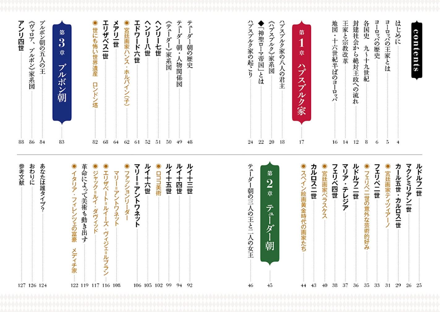 | 15~18世紀のヨーロッパに君臨したハプスブルグ、テューダー、ブルボンの3つの王家の人々を時代背景や美術とともに紹介。複雑な王家の人間模様や系図をイラストでわかりやすく解説。 |