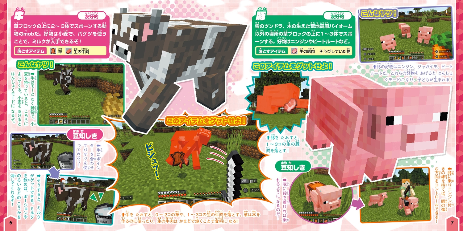 牛や豚、羊、馬といったサバイバル生活に欠かせない動物はもちろん、水中に生息するイカやウーパールーパーなど総勢38種類のmobを一挙掲載した図鑑です。
