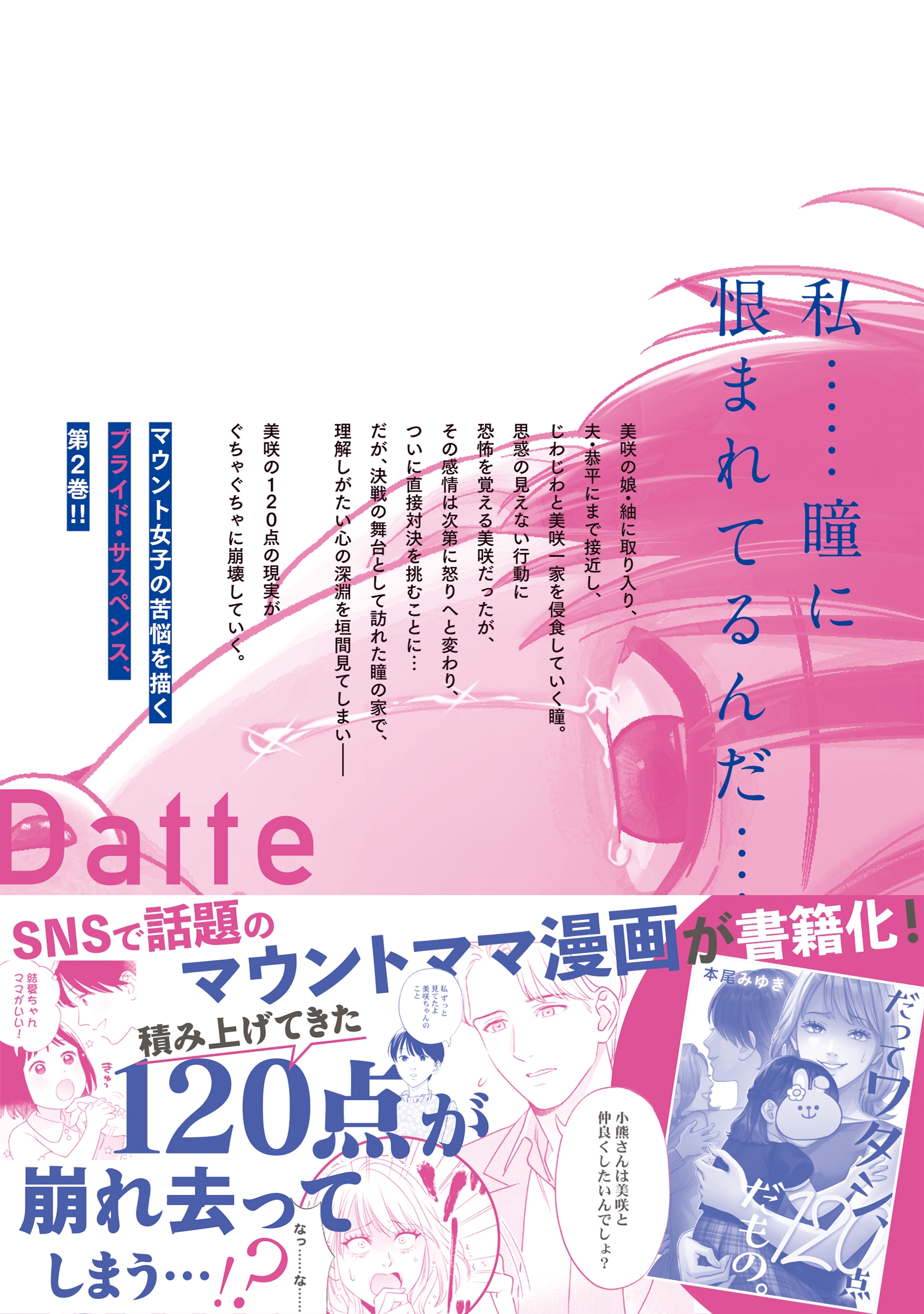 | 私……瞳に恨まれてるんだ…… 美咲の娘・紬に取り入り、夫・恭平にまで接近し、 じわじわと美咲一家を侵食していく瞳。 思惑の見えない行動に恐怖を覚える美咲だったが、 その感情は次第に怒りへと変わり、 ついに直接対決を挑むことに… だが、決戦の舞台として訪れた瞳の家で、 理解しがたい心の深淵を垣間見てしまい―― 美咲の120点の現実がぐちゃぐちゃに崩壊していく。 マウント女子の苦悩を描くプライド・サスペンス、第2巻!! |