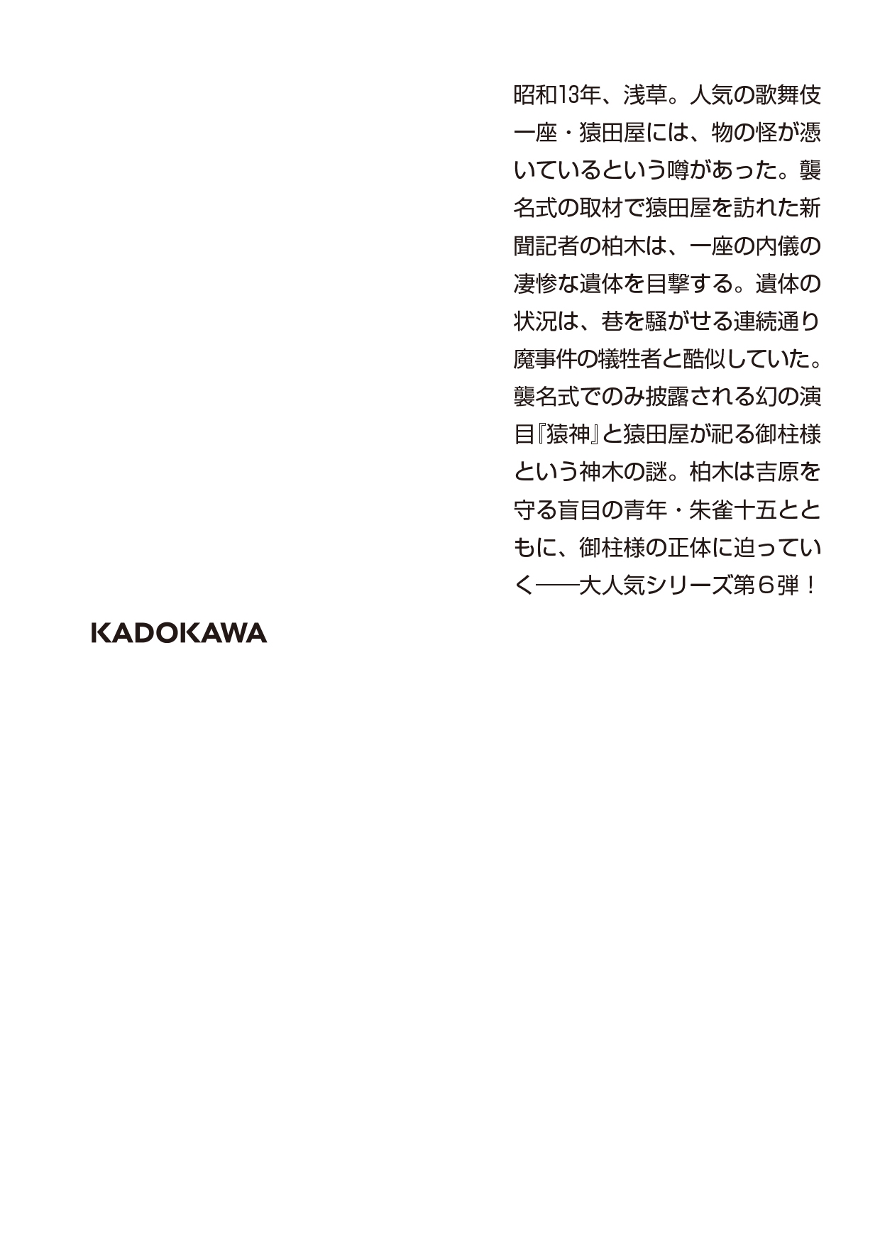 | 昭和13年、浅草。人気の歌舞伎一座・猿田屋には、物の怪が憑いているという噂があった。 襲名式の取材で猿田屋を訪れた新聞記者の柏木は、一座の内儀の凄惨な遺体を発見する。 遺体の状況は、巷を騒がせる連続通り魔事件の犠牲者と酷似していた。 襲名式でのみ披露される幻の演目『猿神』と猿田屋が祀る御柱様という神木の謎。 柏木は吉原を守る盲目の青年・朱雀十五とともに、御柱様の正体に迫っていく――大人気シリーズ第6弾! |