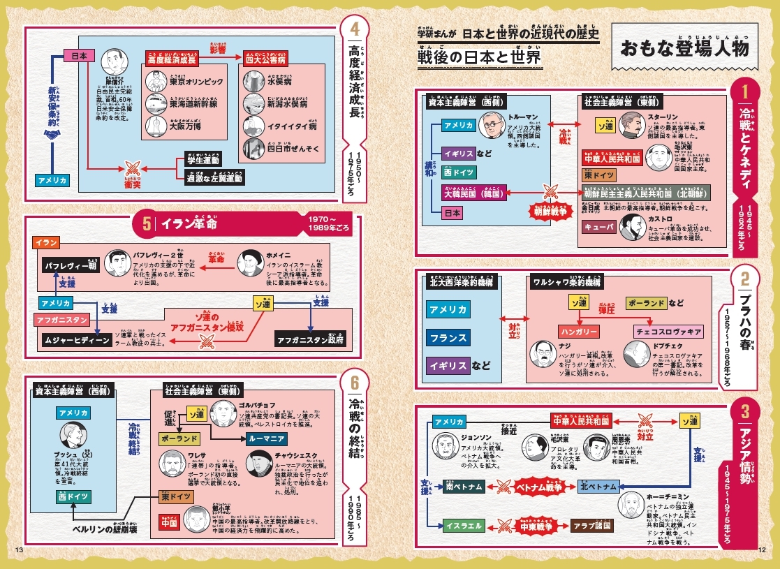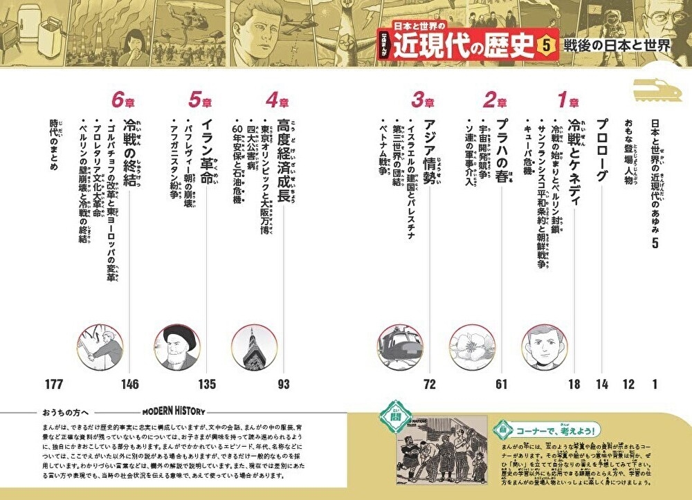 | 現在(いま)がわかる、未来が見える。 「問い」で読み解く 歴史まんが 【第5巻】冷戦の始まりから終結までの世界情勢、日本の高度経済成長~オイルショックの時代まで! 第二次世界大戦後、世界はアメリカ中心の資本主義陣営と、ソ連中心の社会主義陣営に分かれて対立しました。これは「冷戦」と呼ばれ、世界各地で衝突が起こりました。一方で、日本は朝鮮戦争をきっかけに特需景気となり、高度経済成長期に入ります。 第二次世界大戦後、世界はどうなっていったのか。 そのころのアジア情勢はどうだったのか。日本の置かれた状況は? 世界各地で起こる、アメリカとソ連の代理戦争とは? 日本の高度経済成長期はどんな様子だったか。 冷戦の終結までの道のりは? 資料写真をもとに「問い」を立てながら、より深く歴史を読み解きます。 |