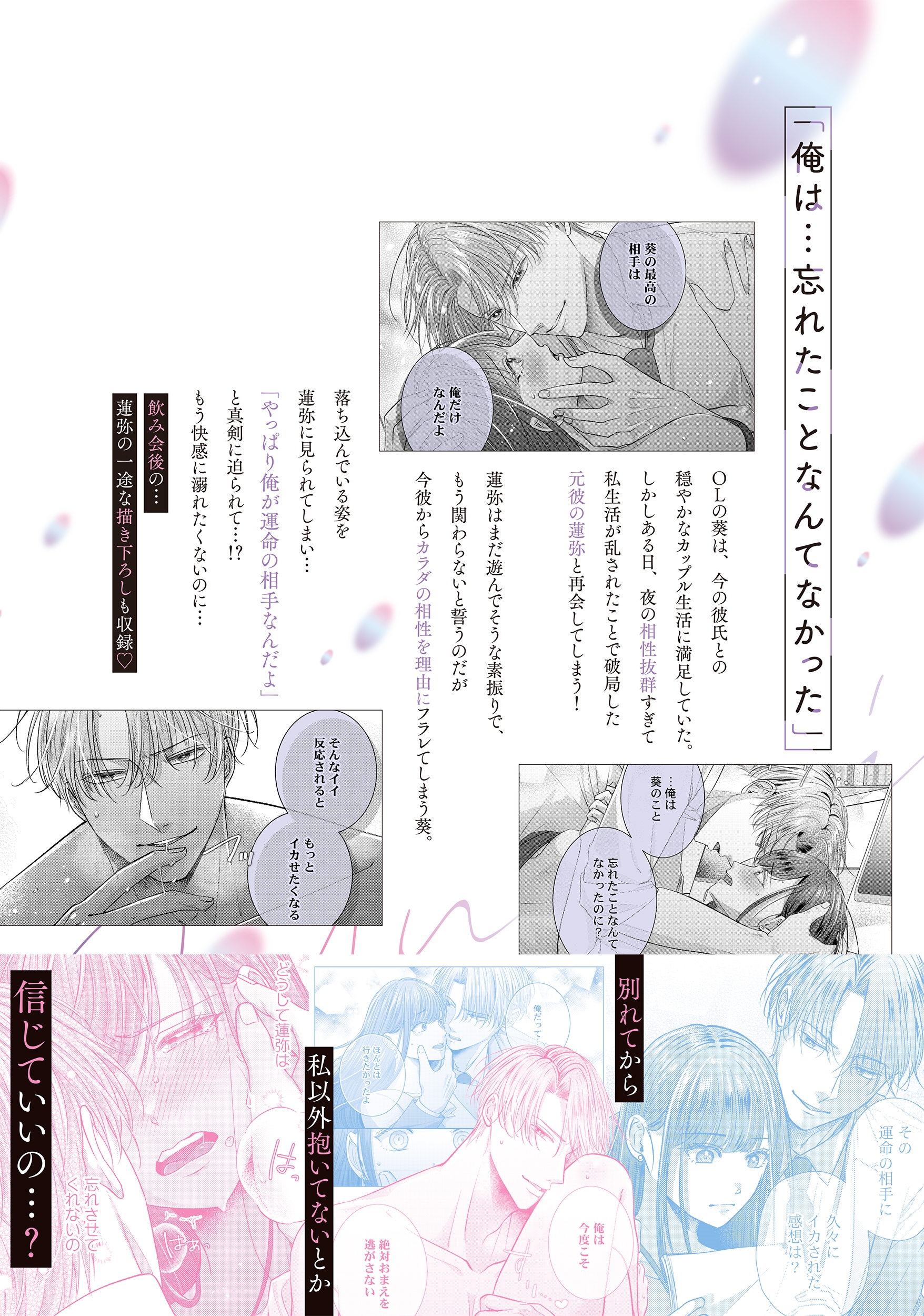 | 「俺は…忘れたことなんてなかった」 OLの葵は、今の彼氏との穏やかなカップル生活に満足していた。 しかしある日、夜の相性抜群すぎて 私生活が乱されたことで破局した 元彼の蓮弥と再会してしまう! 蓮弥はまだ遊んでそうな素振りで、もう関わらないと誓うのだが 今彼からカラダの相性を理由にフラレてしまう葵。 落ち込んでいる姿を蓮弥に見られてしまい… 「やっぱり俺が運命の相手なんだよ」と真剣に迫られて…!? もう快感に溺れたくないのに… 飲み会後の…蓮弥の一途な描き下ろしも収録! |
