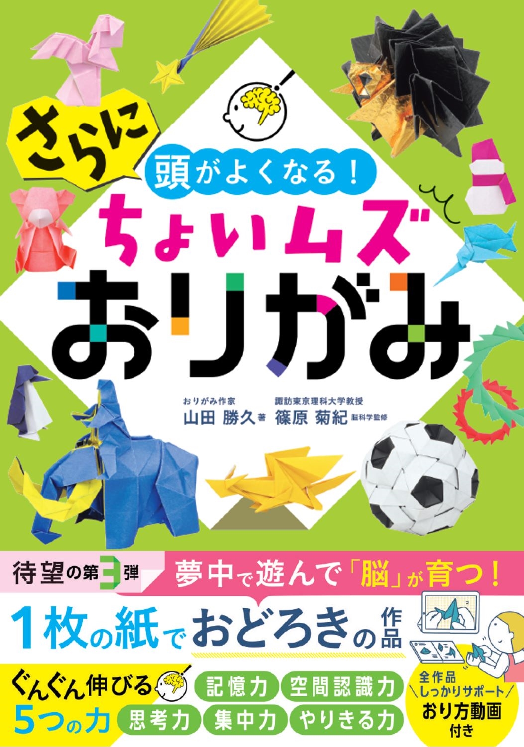 | 大好評「ちょいムズおりがみ」に待望の第3弾が登場! 平面から立体、紙1枚から作り出す! おればおるほど脳を刺激し、頭がよくなります。 ちょっと難しいけど、だから頭がよくなる!折り応えのある作品にこだわった、児童向け折り紙本。 <主に鍛えられる能力> ワーキングメモリー/空間認知能力/やりきる力/集中力/実行機能・・・・ ★脳科学の専門家、篠原菊紀氏監修 ★全作品おり方動画付き(PC・スマートフォンで視聴できる) ★チャレンジ!達成感抜群の激ムズ作品も! 難易度は一般の児童向けおりがみ本より、やや難しめです。 <もくじ> 脳とおりがみについて もくじ 作品紹介ビジュアルページ この本の取り組み方 おり図の見方 基本のおり方 れんしゅう1 はばたく鳥 れんしゅう2 さかな れんしゅう3 セミ パート1 ちょいムズ入門 No.1 富士山 No.2 おひなさま No.3 野球帽とバット No.4 指輪 No.5 丹波竜 No.6 ながれ星 No.7 シスター No.8 クマ パート2 ちょいムズ No.9 ミナミコアリクイ No.10 雪だるま No.11 ペンギン No.12 バッタ No.13 錦鯉 No.14 天使の像 No.15 フクロウ No.16 バショウカジキ No.17 コモドドラゴン No.18 コアラ パート3 激ムズ No.19 阿波踊り No.20 カラス天狗 No.21 メガロドン No.22 ハリネズミ No.23 ベオウルフ・ドラゴン No.24 マンモスにのる人 etc・・・ そのほかにも図形の折り紙など、知的好奇心をくすぐる作品を多数収録! |