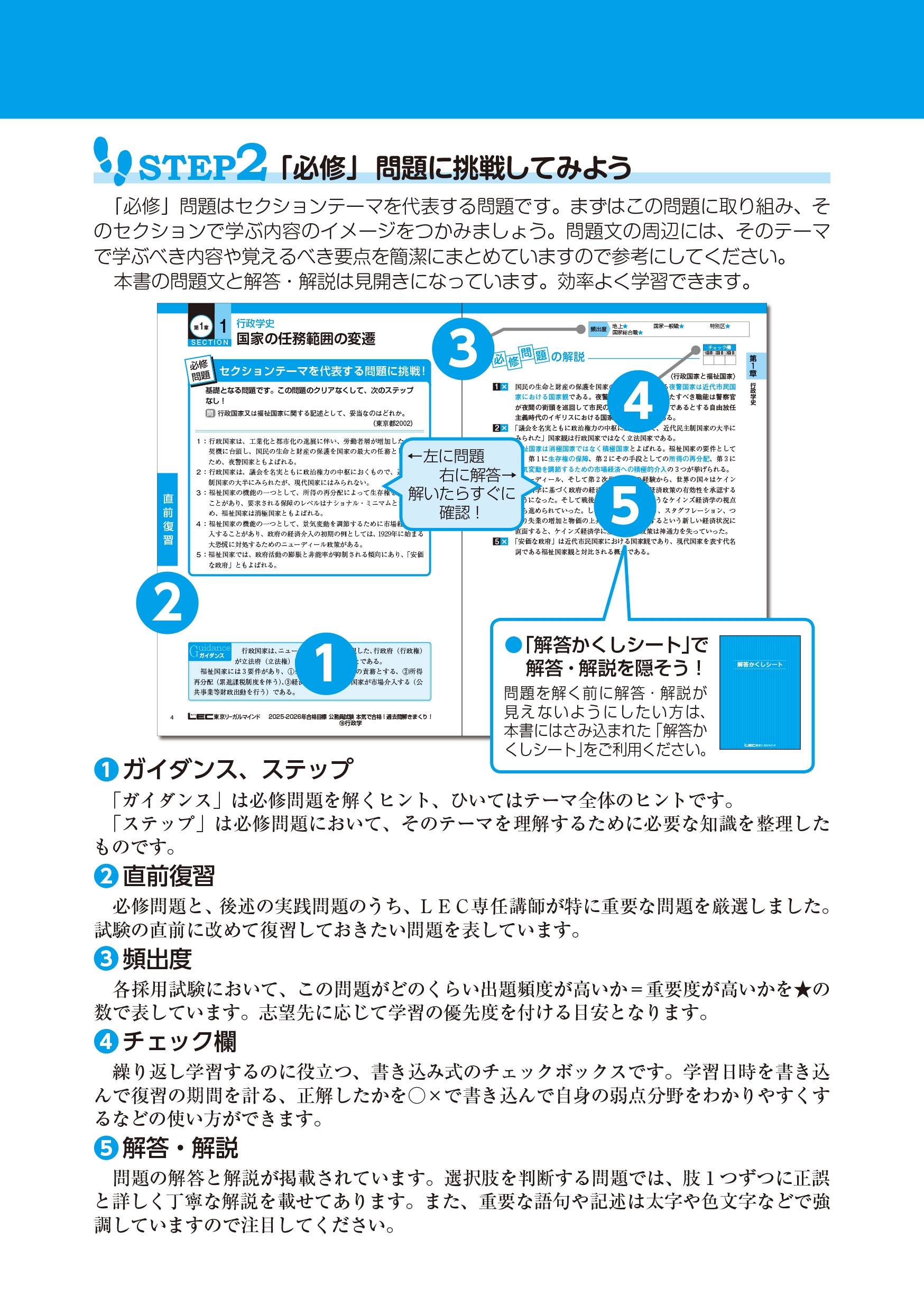 | ☆最新2024年度実施の試験問題を収録! ☆公務員試験は、解いた数だけ合格が近づく! 過去問を『繰り返し解く』ことで合格が近づく! 『解きまくり』は合格に必要な問題を豊富に収録し、 「本気で合格を目指す」受験生の皆さまを全力でバックアップ! ◆◇◆『解きまくり』 5つの特長◆◇◆ 1.最新!「2024年の本試験問題」を収録! 公務員試験は年々変化しています。 最新年度の過去問を収録できるのは、毎年改訂の『解きまくり』ならでは! 本書で学習すれば、いち早く最新の試験傾向を把握できるので安心して学習できます。 2.LECだからできる!入手困難な地方上級再現問題も収録! 『解きまくり』は、なかなか手に入りにくい地方上級の再現問題を数多く収録しています。 これぞLECの情報力ならでは!受験生のニーズに応えます! 3.充実の問題数! 公務員試験合格には、類似問題を繰り返し解くことが大切。 本書は十分な量の良質な過去問と、詳細な解説を掲載していますので、繰り返し解くことにより、知識の定着と解法パターンの習得を図ることができます。 これぞ合格への近道です。 4. 段階的な学習が可能! 本書の問題は、必ずマスターすべき「必修問題」と、<基本>と<応用>の2つのレベルの「実践問題」で、無理なくステップアップできる構成になっています。 (1)まず手始めに代表的な問題「必修問題」で、このセクションでの学習の要点を掴みます。 (2)次に「実践問題」で本格的に過去問に取り組みます。 1周目は「基本レベル」を中心に解き、2周目からは、志望先で出題頻度が高い「応用レベル」にチャレンジ! 5.効果的な学習を可能にするコンテンツ 自分の志望先の傾向がわかる「出題傾向分析」、解くためのベースとなる「インプット(講義ページ)」、直前期に復習すべき問題をピックアップした講師厳選「直前復習」など、メリハリをつけて学習できる工夫が満載です。 ※本書は、地方上級、国家一般職、国家総合職などに対応しています。 |