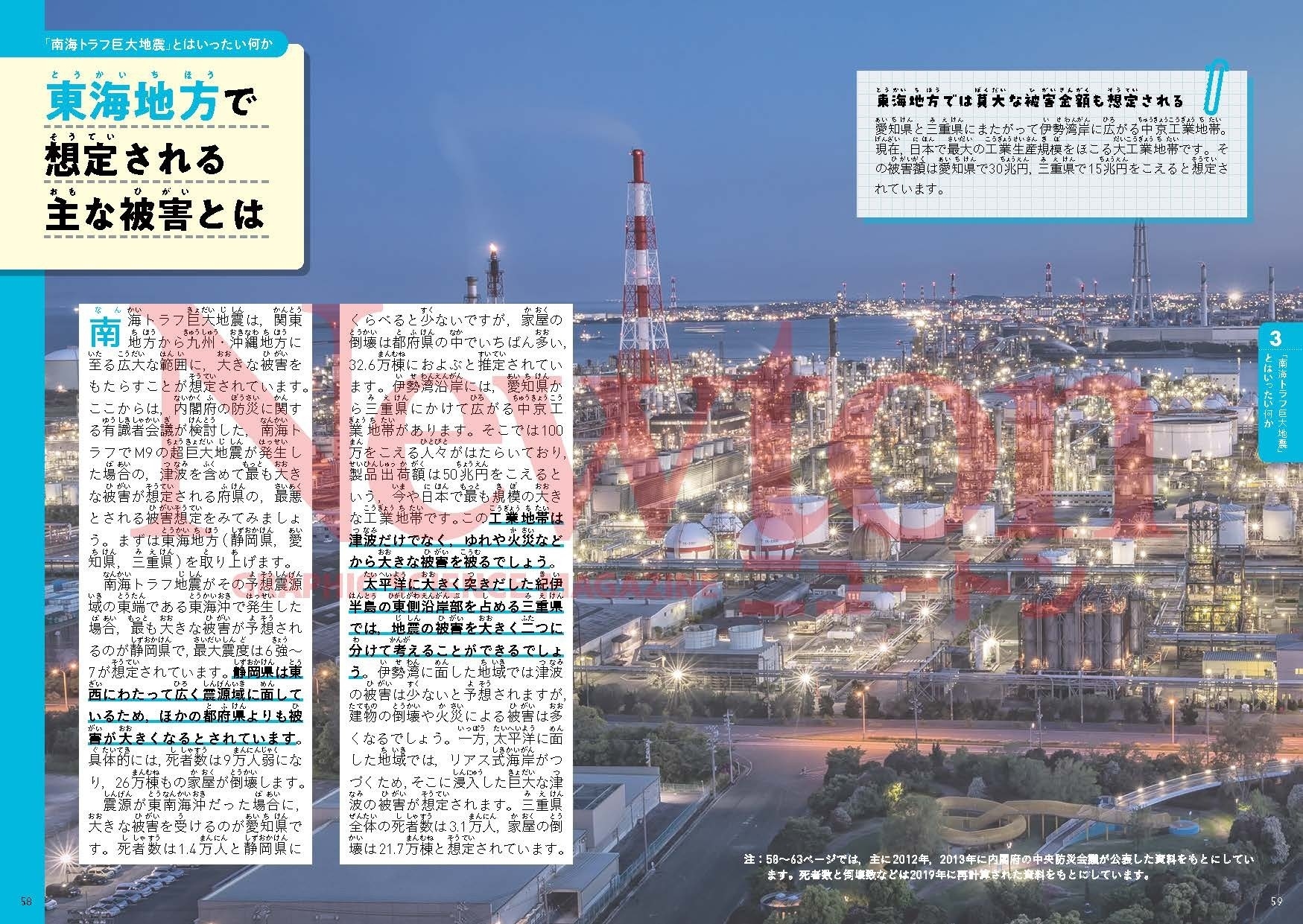 | 南海トラフ地震に首都直下型地震 何を想定し,どう備えるべきか すぐそこにせまる脅威 巨大地震 あらゆる災害の中で,地震は最もおそろしい現象だといえるかもしれません。地震は発生の予測が非常にむずかしいのが,その理由の一ひとつでしょう。日本は特に地震の頻度が高い国です。近年でも,たびたび大きな地震が発生しています。そして,今後も巨大地震は,また確実に発生すると考えられています。 その中でも発生確率が高いと予想されているのが,「南海トラフ地震」と「首都直下型地震」です。いったい巨大地震とはどのようなメカニズムでおこるのか。具体的にどのような被害が想定されているのか。それに対してどう備えるべきか。 この本は,"地震大国"日本に住む私たちの知るべき情報がつまった一冊です。 |