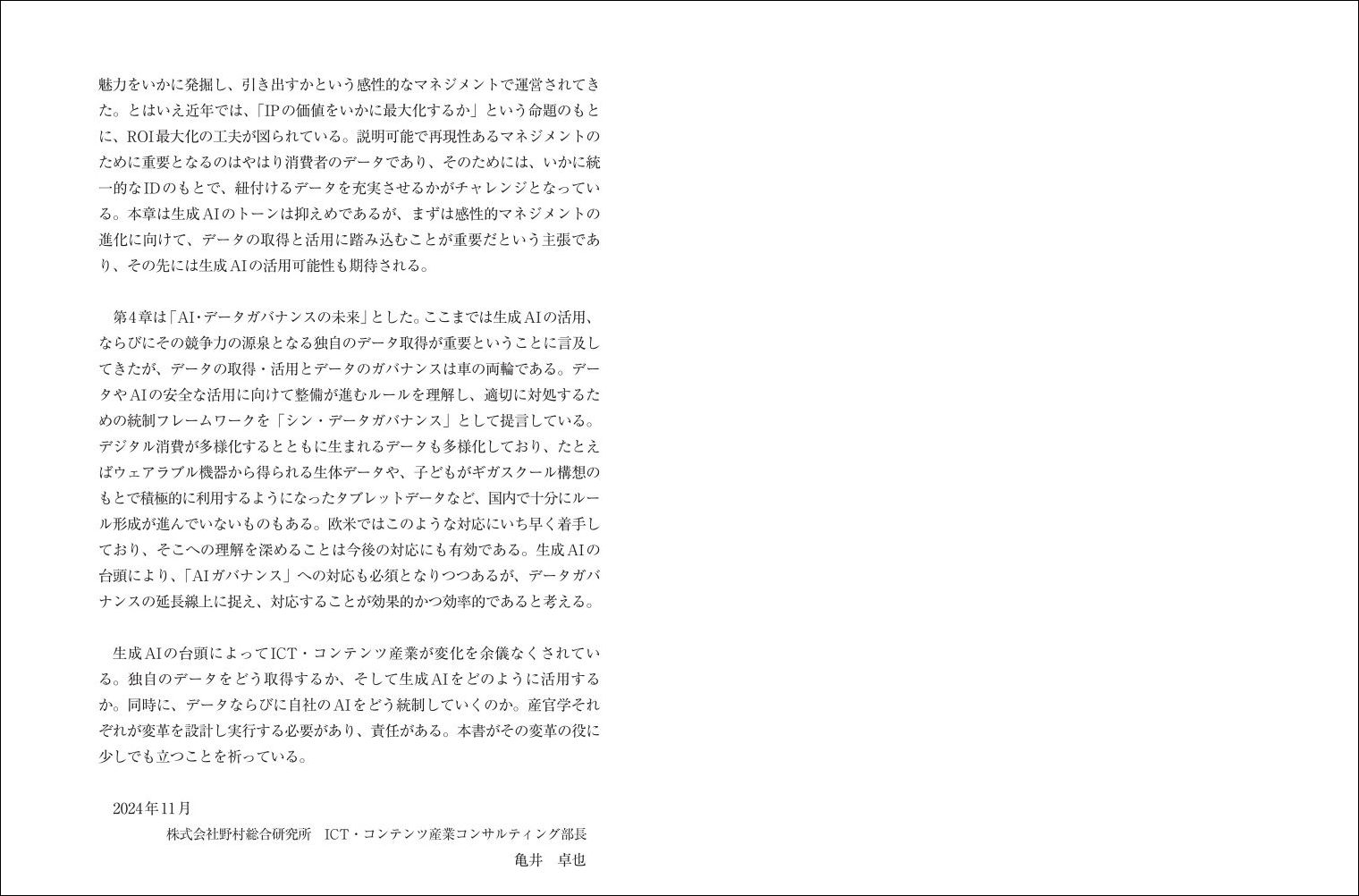 | データ活用とAIの進化は私たちの生活をどのように変えるのか? デジタルライフ、通信・メディアビジネス、コンテンツビジネス、AI・データガバナンスの未来を洞察、 8つの市場の成長を徹底予測! 【主な内容】 第1章デジタルライフの未来 ・複雑化するデジタルライフ ・生成AIで揺れるデジタルディバイド ・推し消費の多様化とAI 第2章 通信・メディアビジネスの未来 ・「スマホの次」の可能性 ・テレビメディアを取り巻くデータ覇権 ・広がる偽・誤情報とビジネスチャンス ・マーケティングにおける戦略的な生成AI活用 第3章 コンテンツビジネスの未来 ・コンテンツビジネスの論点 ・試されるゲーム大国日本 ・DXで進化するスポーツビジネス ・教育コンテンツの未来 第4章 AI・データガバナンスの未来 ・「シン・データガバナンス」── デジタル規制の克服 ・ウェアラブルデータの活用とガバナンス ・「子どものデータ」を考える ・データの越境流通とガバナンス ・世界的に急伸するAI規制と対応 |