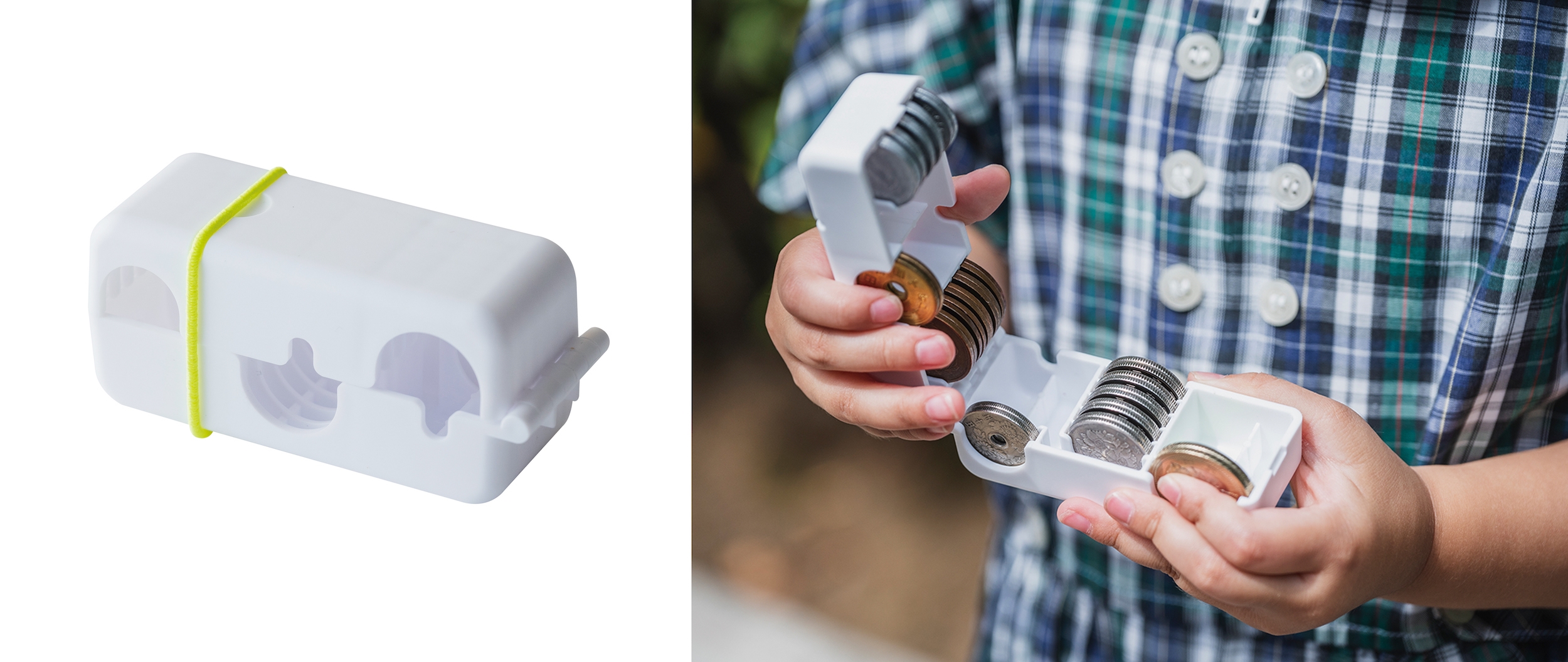 | グッドデザイン賞受賞! 誰でも見やすく使いやすいコインケース・ニコニコイン。一・十・百円玉は各10枚、五・五十・五百円玉は各2枚収納可。初めてのおかねの学びにぴったりの冊子付き。 |
