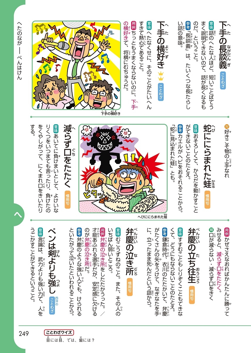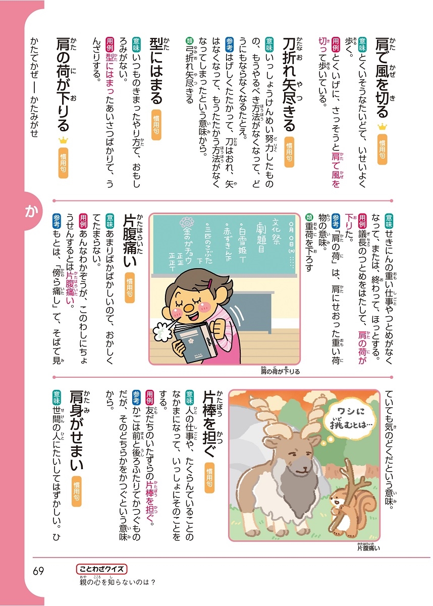 | 日常生活や学習に役立つ「ことわざ」を約1800語収録した辞典です。ことわざには重要度ランク表示もあり、中学入試対策にも最適。 お子さまはもちろん、大人のみなさまも気軽に教養を身につけられる一冊です。 ページに1つ以上、「ことわざ」の理解に役立つ愉快なイラストが掲載されています。 「4コマまんが以外で学習に取り組みたい」「文字ぎっしりだとハードルが高い……」と思う方におすすめします。 巻末には「動物の名前の入ったことわざ」「数字の入ったことわざ」などのキーワードから探せる分野別索引も掲載しています。 学校の勉強や調べ学習でも大活躍の辞典です。 |