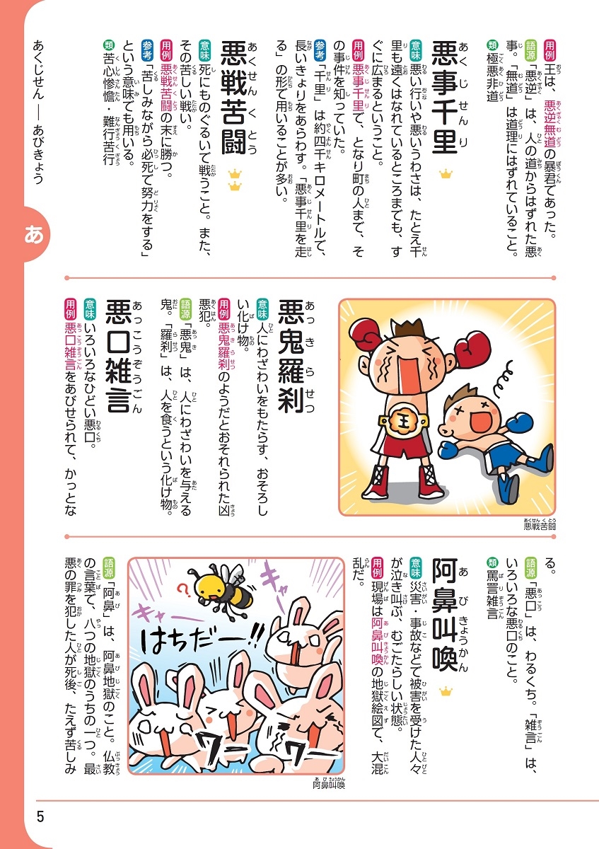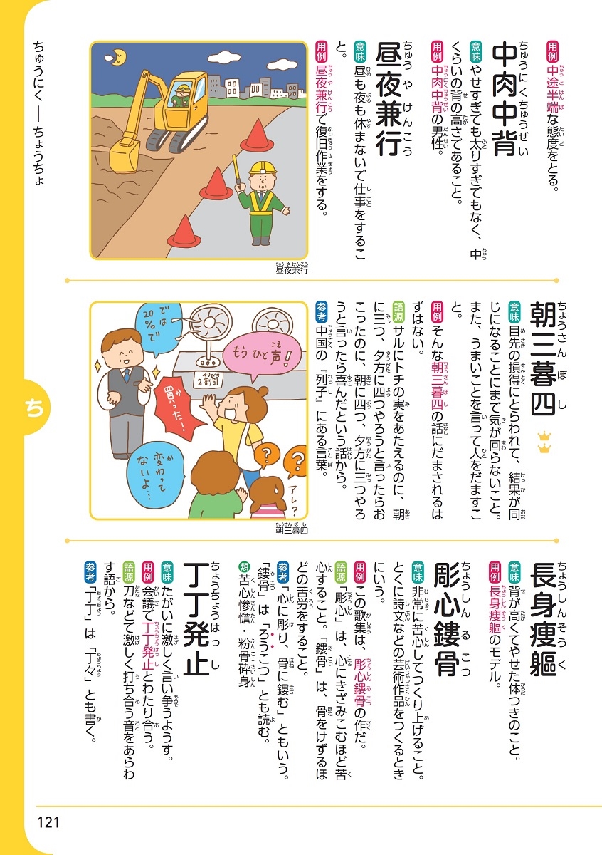 | 教養として覚えておきたい四字熟語を約1000語収録。重要度ランク表示つき。1ページに2つ、解説のたすけとなるイラストを掲載。使い方の用例があるので文章や会話表現に役立つ。すべての漢字にふりがなつきなので、小学校低学年からでも読める。 |