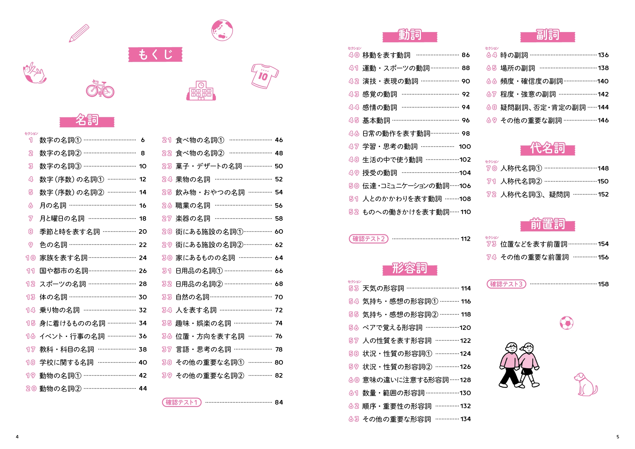 | ずっと役に立つ英単語は、英語の土台づくりに超重要! パターン&反復練習で英単語がしっかり身につく!くり返し書くことで自然と覚える! 【特長1】3つのパターンでくり返し書くだけ! Q1:英単語の書き取り練習 → Q2:書き取り問題(日本語⇒英語) → Q3:空所補充問題 とくり返し練習しているうちに、英単語が自然と身につきます。 【特長2】品詞・テーマ別だから覚えやすい! 中学1年生で習う英単語を品詞・テーマごとに分類。一気にまとめて覚えやすく、記憶にも残りやすい配列です。 【特長3】1セクション2ページ構成なので手軽にサクサク取り組める! 1回2ページなので、英語が苦手な人でも無理なく自分のペースで進めることができます。 また、手を離しても閉じない「180°フラット製本」のため、書き込みのストレスを感じることなくどんどん進められます。 【特長4】QRコードで手軽に音声再生! 紙面上のQRコードを読み取ることで、スマートフォンやタブレットで英単語と日本語訳の音声を手軽に再生できます。各単語の「暗唱用例文」も音声つきです。 また、音声は無料リスニングアプリからもダウンロードいただけます。 ★無限パターン練習プリント★ 付録として、紙面上のQRコードから書き方練習ページをダウンロード&プリントすることができます。覚えるまで何度でも書いて練習しましょう。 |