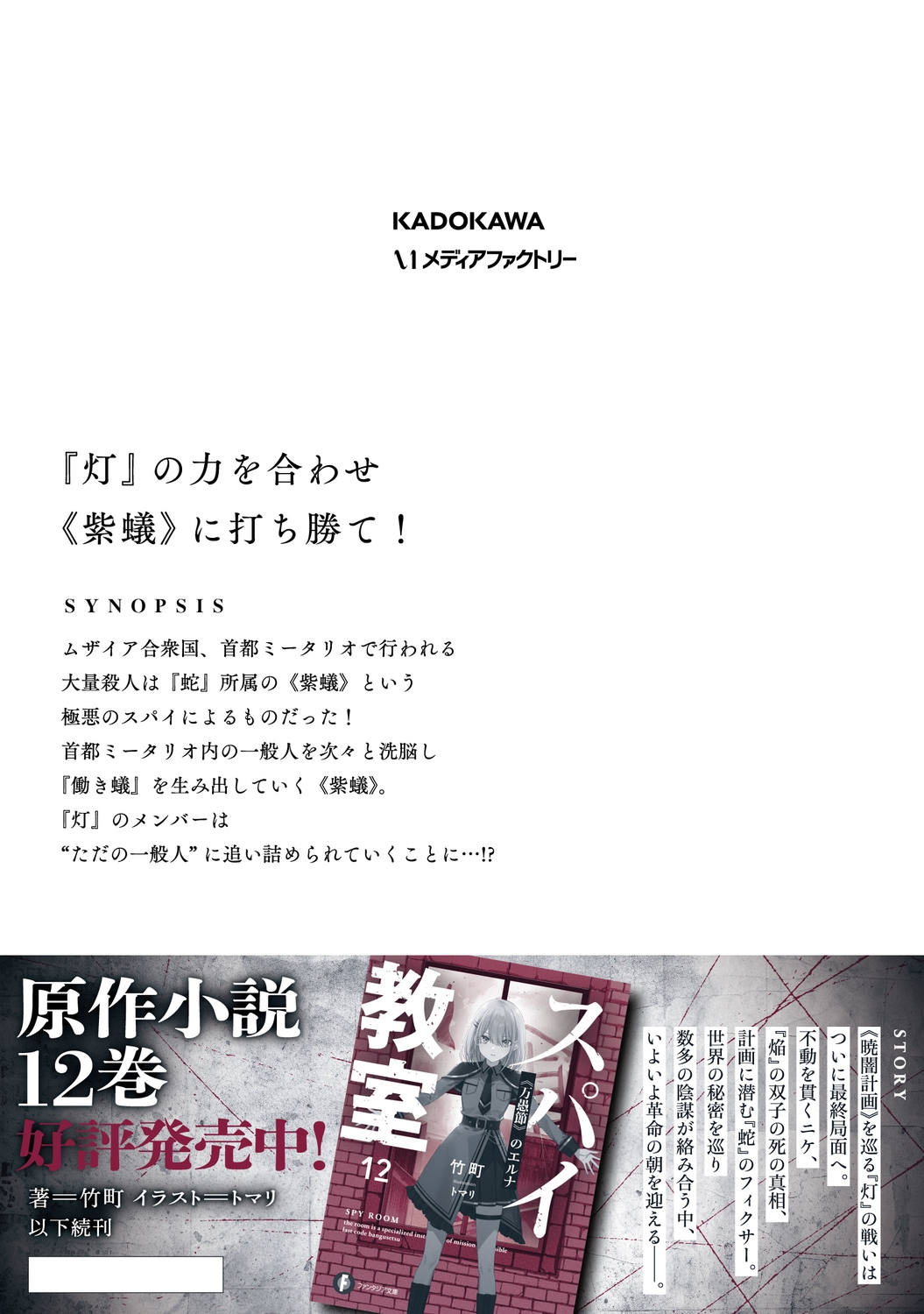 | web新時代を代表する、本格派・超スパイアクション第2弾! ムザイア合衆国、首都ミータリオを襲う大量殺人は『蛇』所属の≪紫蟻≫という人物によるものだった! 一般人を洗脳とした『働き蟻』を生み出し、次々と『灯』のメンバーは追い詰められていくが――? |