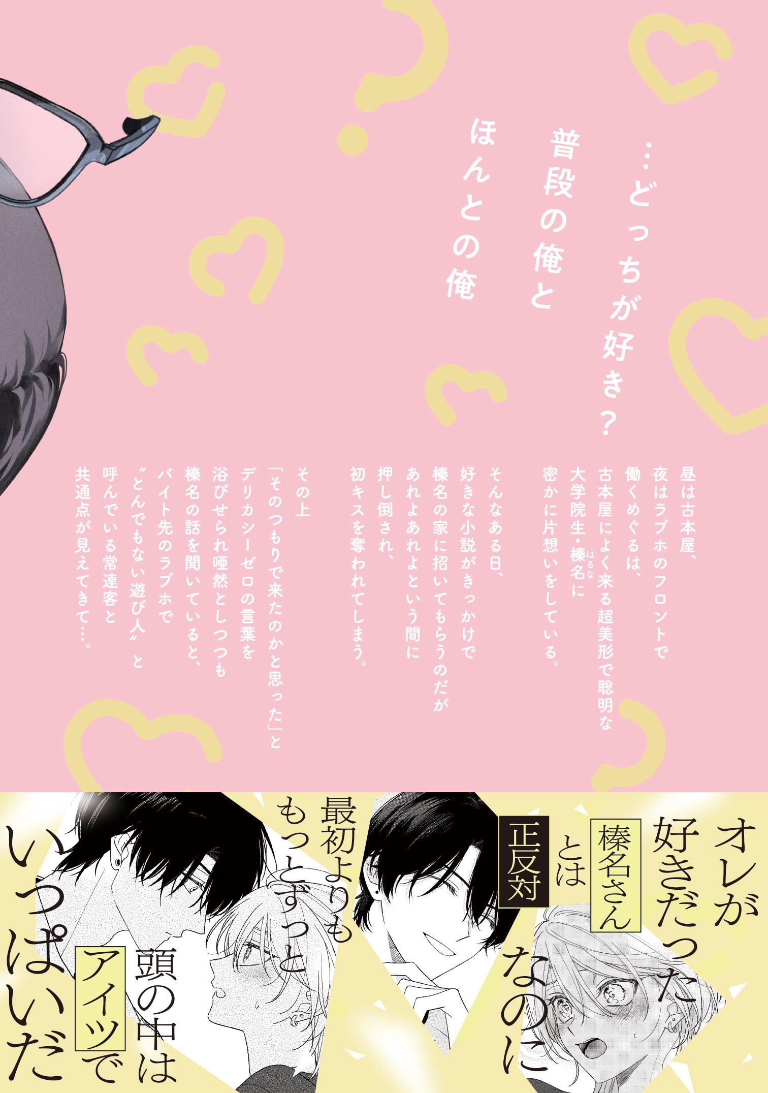| 『…どっちが好き?普段の俺とほんとの俺』 昼は古本屋、夜はラブホのフロントで働くめぐるは、 古本屋によく来る超美形で聡明な大学院生・榛名に密かに片想いをしている。 そんなある日、好きな小説がきっかけで榛名の家に招いてもらうのだが あれよあれよという間に押し倒され、初キスを奪われてしまう。 その上「そのつもりで来たのかと思った」と デリカシーゼロの言葉を浴びせられ唖然としつつも 榛名の話を聞いていると、 バイト先のラブホで"とんでもない遊び人"と 呼んでいる常連客と共通点が見えてきて…。 |