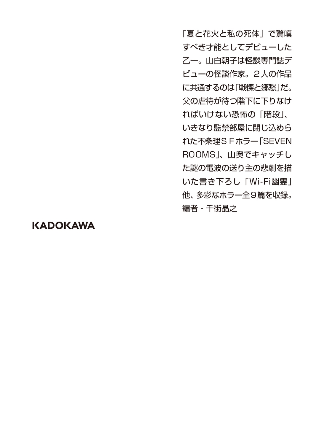 | 乙一&山白朝子の初期~現在までの怖い作品ばかりを厳選収録した怪奇ホラーコクション企画。「夏と花火と私の死体」でデビューした乙一は、デビューから「死」を描いてきた。山白朝子は、怪談雑誌「幽」 の創刊時、デビューした怪談作家。今回は、ホラーを描き続ける作家二人の初のホラー文庫企画。ホラー文庫創刊30周年のフィナーレを飾る記念企画。作品のセレクトはホラー評論家&ミステリ評論家の千街晶之さん。本書刊行にあたり表題作となる中編「Wi-Fi幽霊」を書き下ろし。 |
