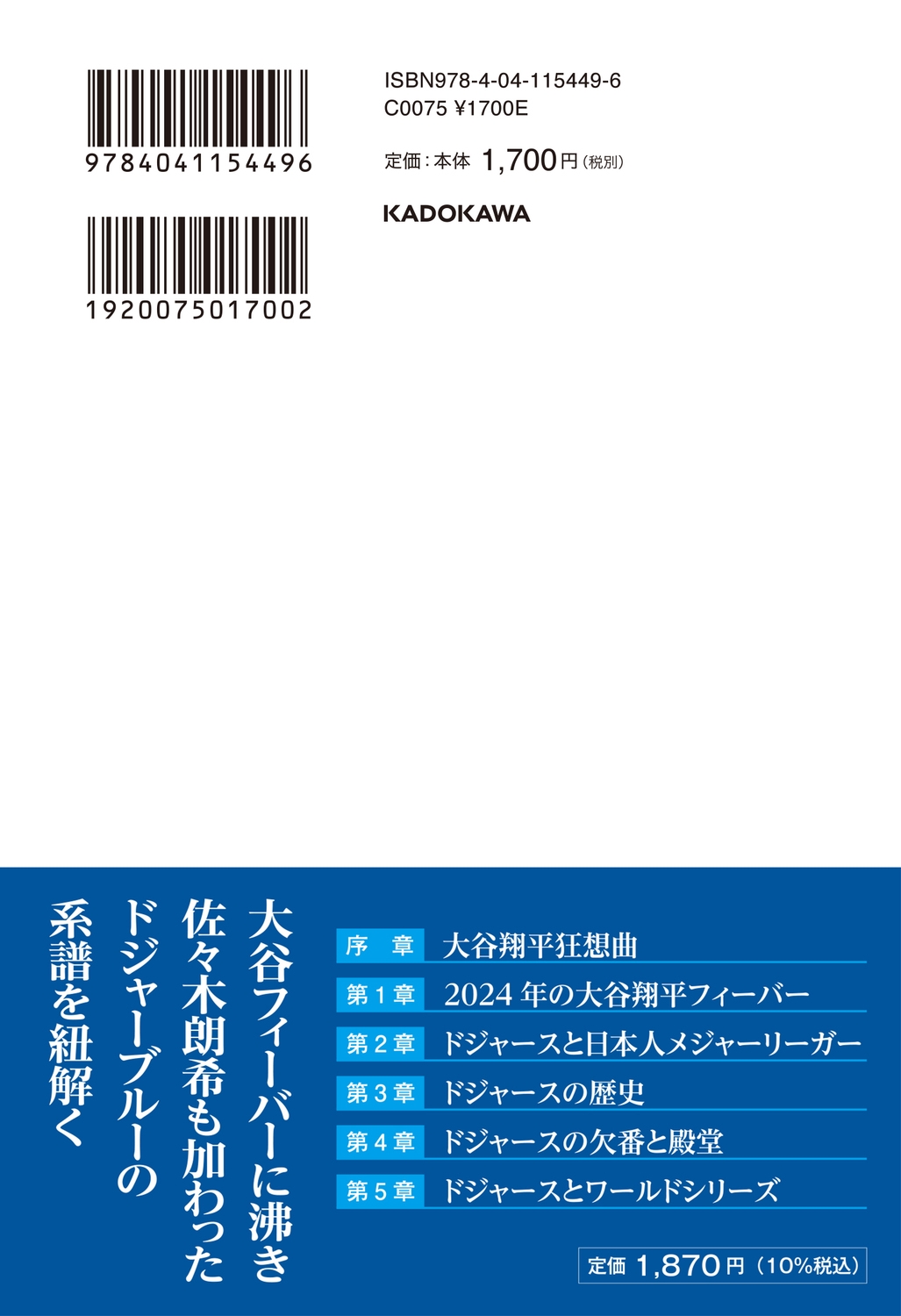 | 破格の大型契約で大谷翔平を招き入れ 移籍1年目にしてワールドシリーズを制覇したロサンゼルス・ドジャース さらには佐々木朗希も加わり、注目度は増すばかりだ 野茂英雄、石井一久、木田優夫 中村紀洋、斎藤隆、黒田博樹 前田健太、ダルビッシュ有、筒香嘉智 大谷翔平、山本由伸、佐々木朗希 実に12名もの日本人選手が所属してきたドジャースとは一体どんな球団なのか? 永久欠番&野球殿堂12名、ワールドシリーズ8度制覇 140年以上の歴史を誇るメジャーリーグ屈指の名門球団を 人気MLBジャーナリストAKI猪瀬が解説 メジャー中継を10倍楽しめる一冊! 【目次】 序章 大谷翔平狂想曲 第1章 2024年の大谷翔平フィーバー 第2章 ドジャースと日本人メジャーリーガー 第3章 ドジャースの歴史 第4章 ドジャースの欠番と殿堂 第5章 ドジャースとワールドシリーズ |