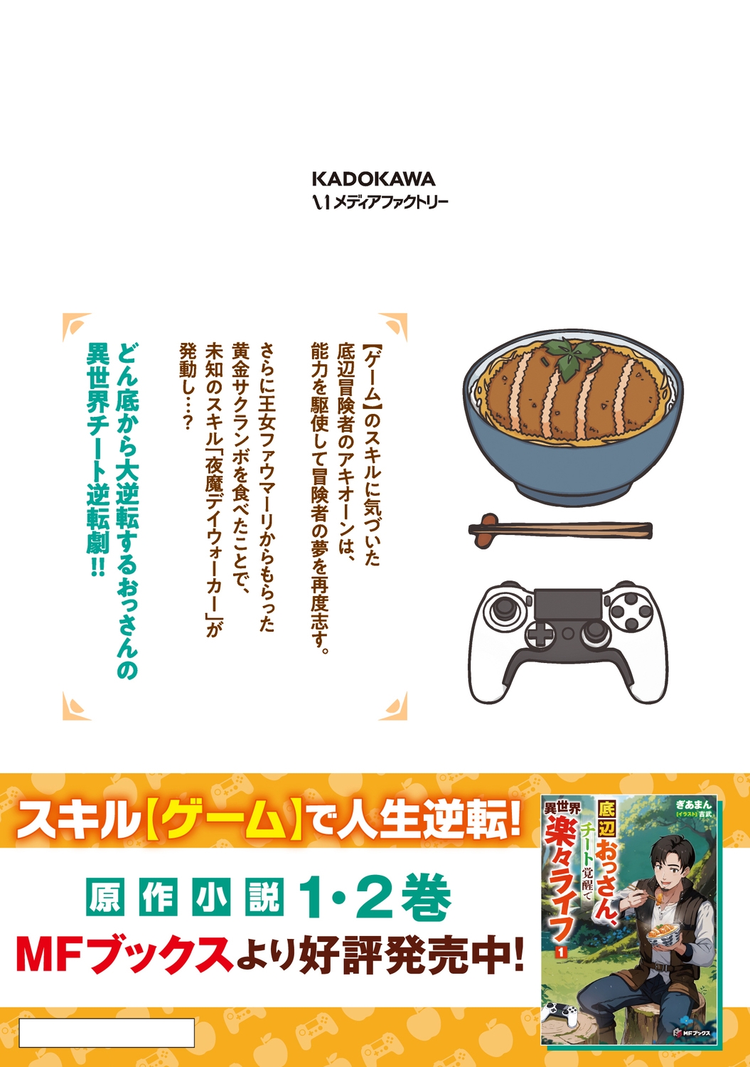 | 異世界で【ゲーム】を遊んで強くなる? おっさん成り上がり冒険譚! 【ゲーム】のスキルに気づいた 底辺冒険者のアキオーンは、 能力を駆使して冒険者の夢を再度志す。 さらに王女ファウマーリからもらった 黄金サクランボを食べたことで、 未知のスキル「夜魔デイウォーカー」が発動し…? どん底から大逆転するおっさんの異世界チート逆転劇!! |